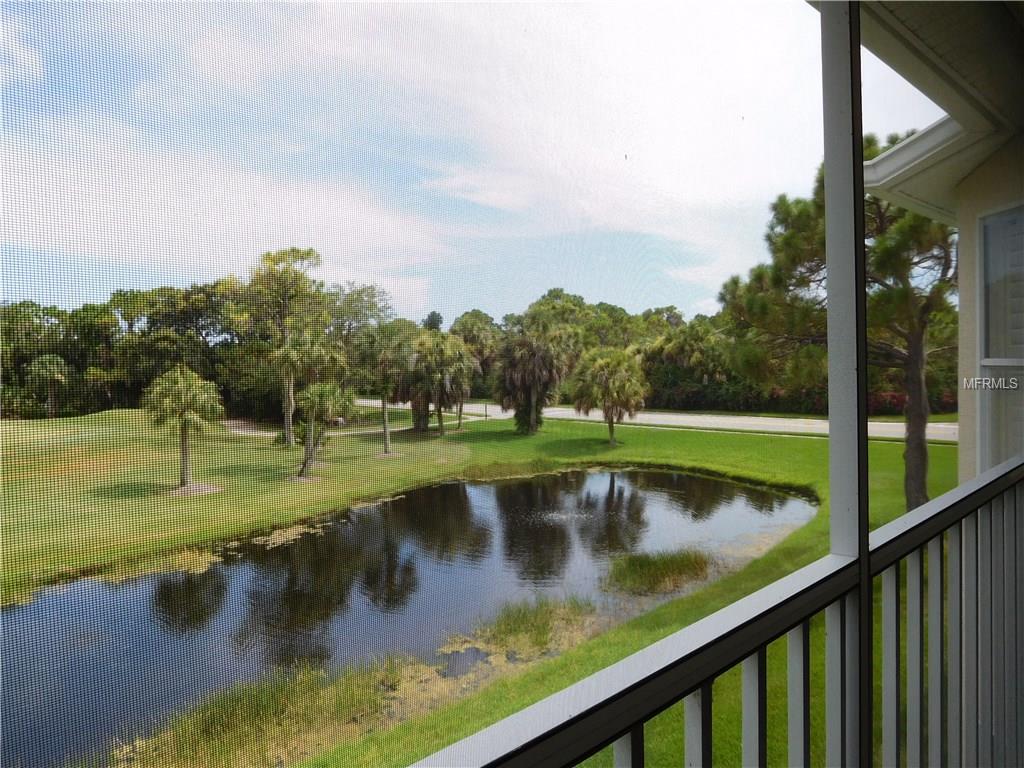 One of the prettiest views in Stoneybrook overlooking the 3rd hole on the golf course. This is special!! This second floor “Barrington” model veranda offers over 1400 sq. ft. of open living space, two bedrooms, two full baths, plus den/office, and is newly furnished and decorated, flat screen TVs, internet access, there is new engineered wood flooring in living and dining area and den. There is a screened entry and rear lanai, a one car detached garage and is conveniently located just a short distance from the heated community pool and tennis courts. The clubhouse is something to be proud of and features casual and formal dining, a grill room, piano lounge and meeting rooms, there is a well equipped fitness center, library, a large heated pool and spa. The community is conveniently located next to the Legacy Bike and Walking Trail and is minutes away from the famed sugary sand beaches of Siesta Key, shops and fine restaurants. The golf membership can be transfered for $250 for the duration of your stay. RENTED NOV THROUGH APRIL, 2020.